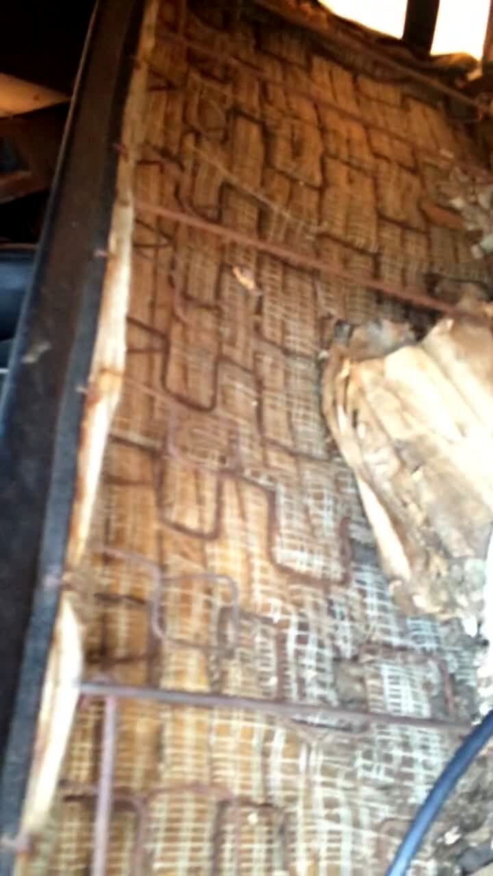 A man with the camera looks inside a bag in a horse trailer and a raccoon jumps out and hisses at him and scares him and he curses and runs away.