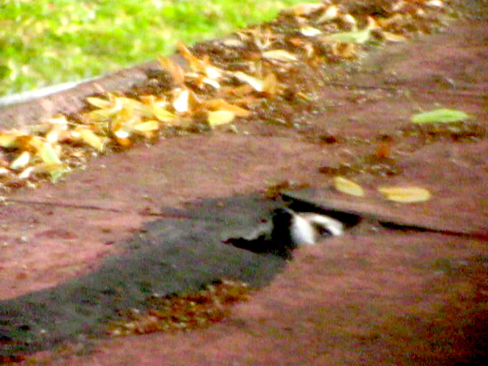 A baby raccoon kit outdoors pokes its head our of a hole in a porch roof covered with leaves. A man off camera says "This is not a raccoon shelter. He's in the house" and sighs.