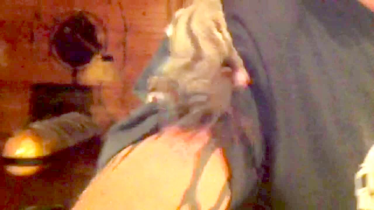 A small rodent looking creature (apparently a sugar glider) crawls on a man's arm. It eventually jumps on woman who is filming at 0:36.