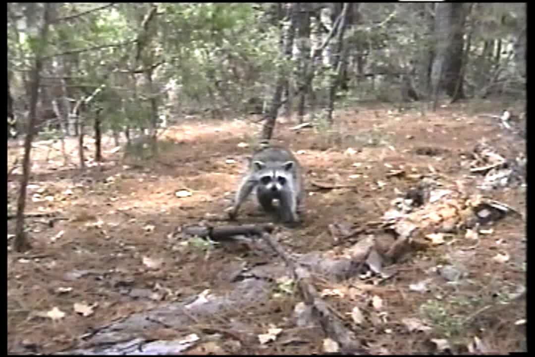"Raccoon Acts Like a Goon" A raccoon walks up the front porch. A woman walks out and shoos it away. The raccoon comes back and chases the woman inside.