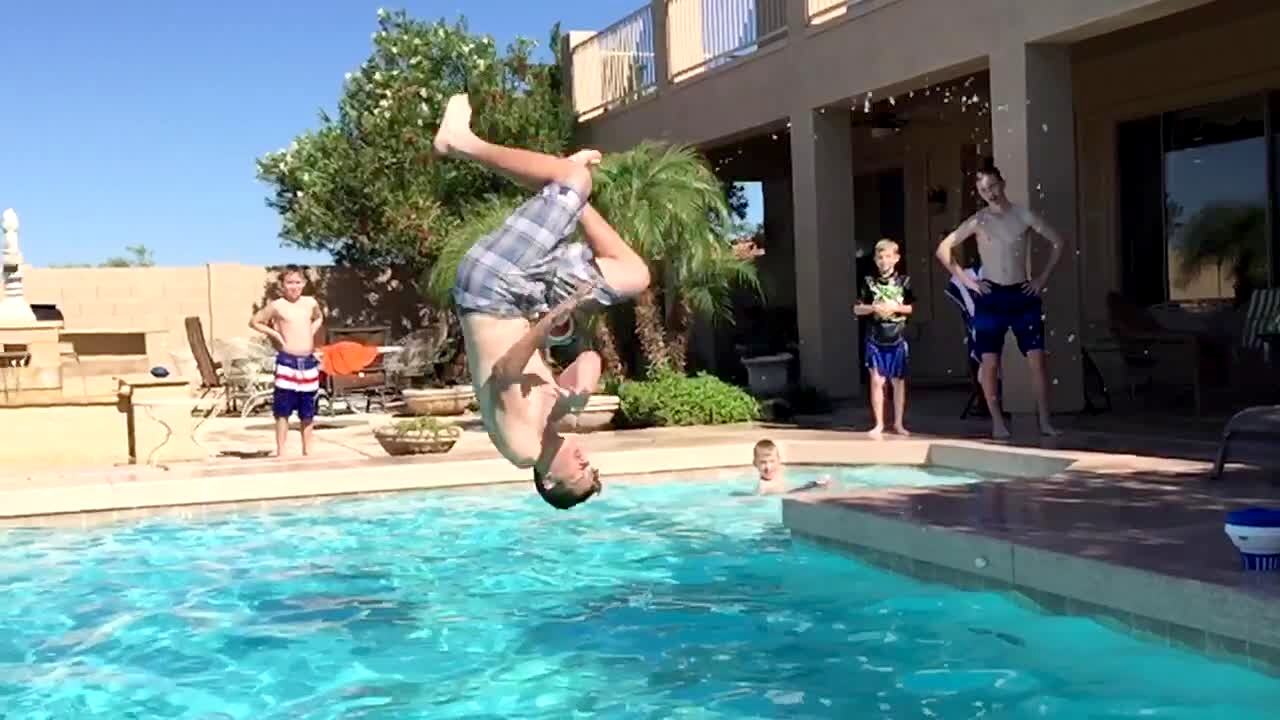 A man jumps off a roof. He bounces on a trampoline and gets caught in a volleyball net as he falls into a swimming pool.