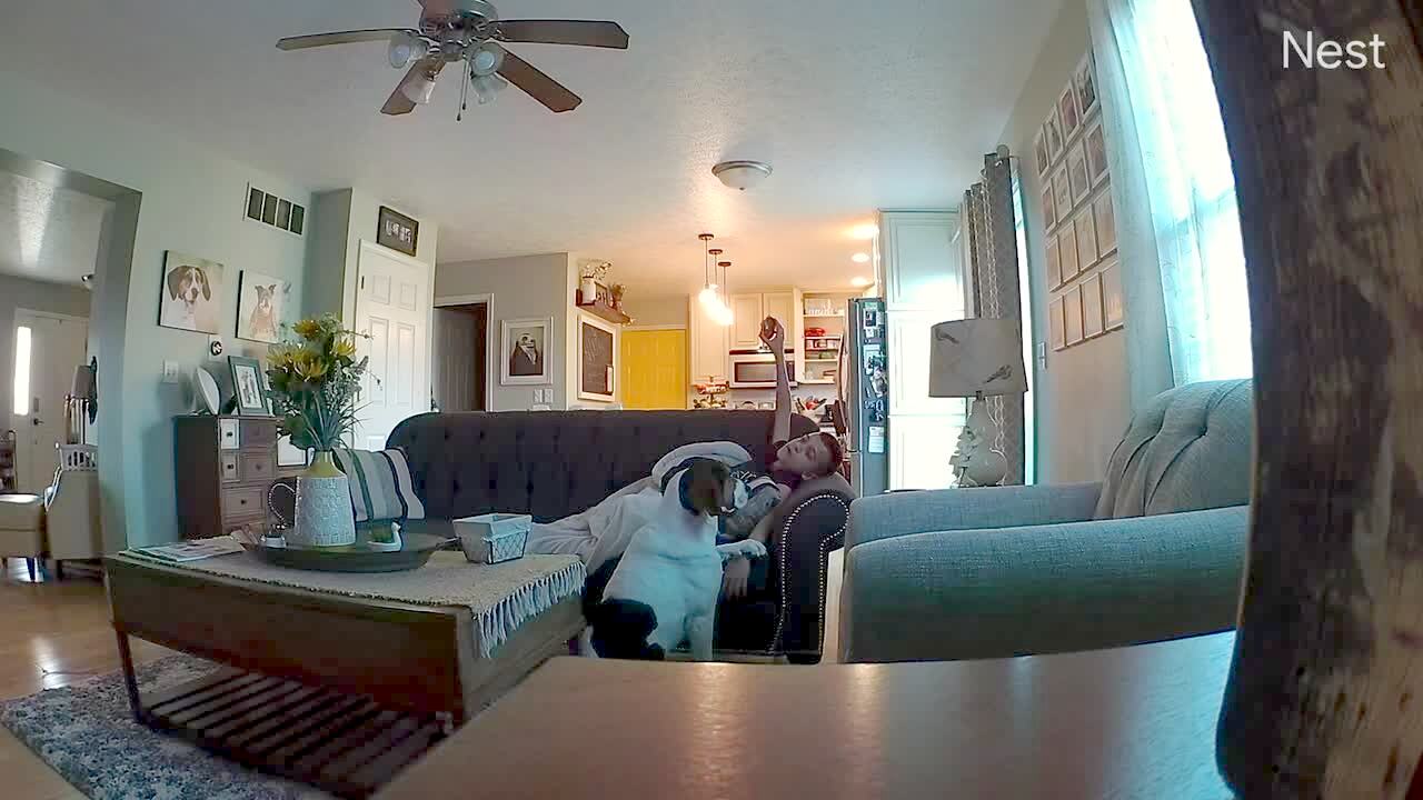 A young boy in a bedroom winds up to throw a baseball to a woman but he suddenly stops and says, "I pooped. The son angrily throws his glove on the ground.