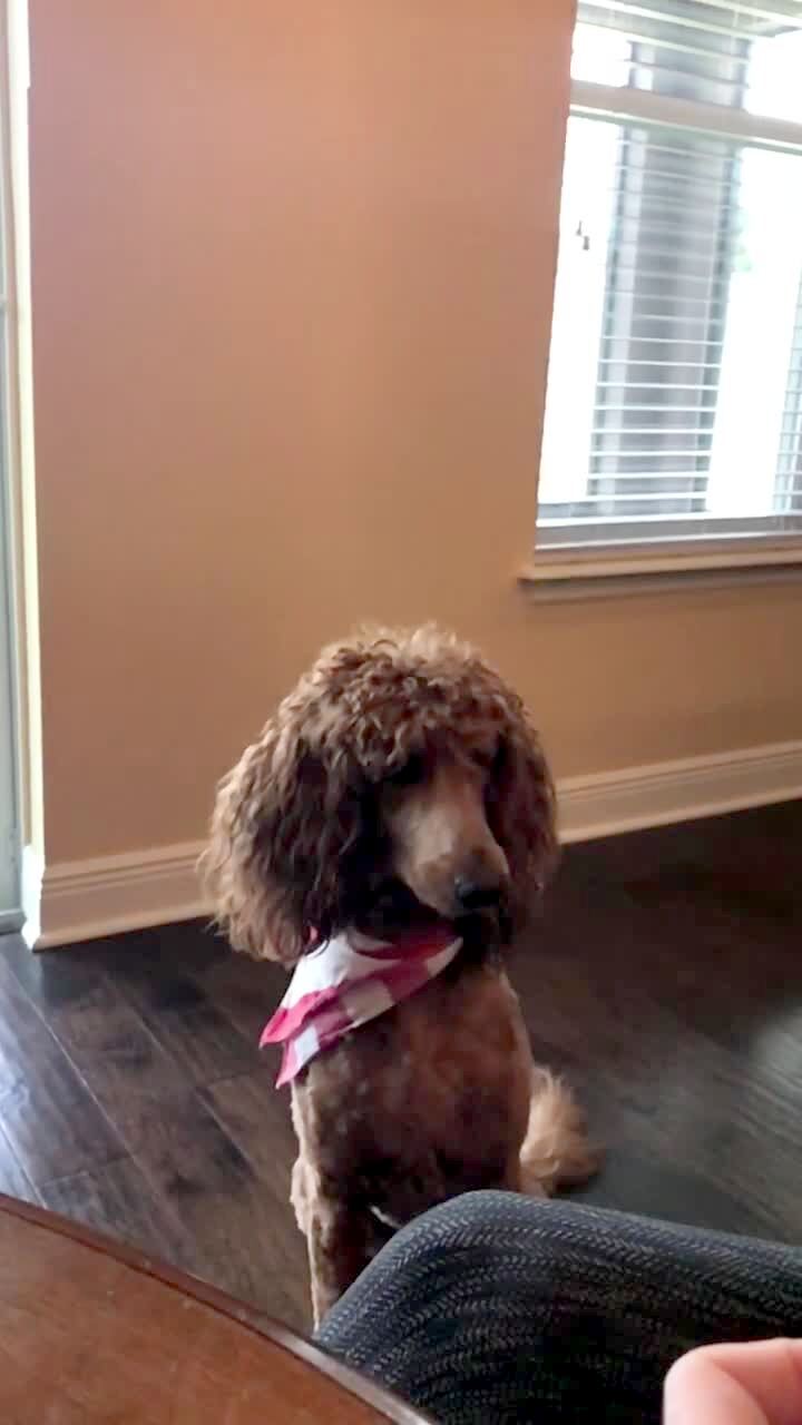 Tot girl waters the plants with a garden hose in the backyard, she points the hose at Dad who's filming. Dad gets upset & hides behind a tree.