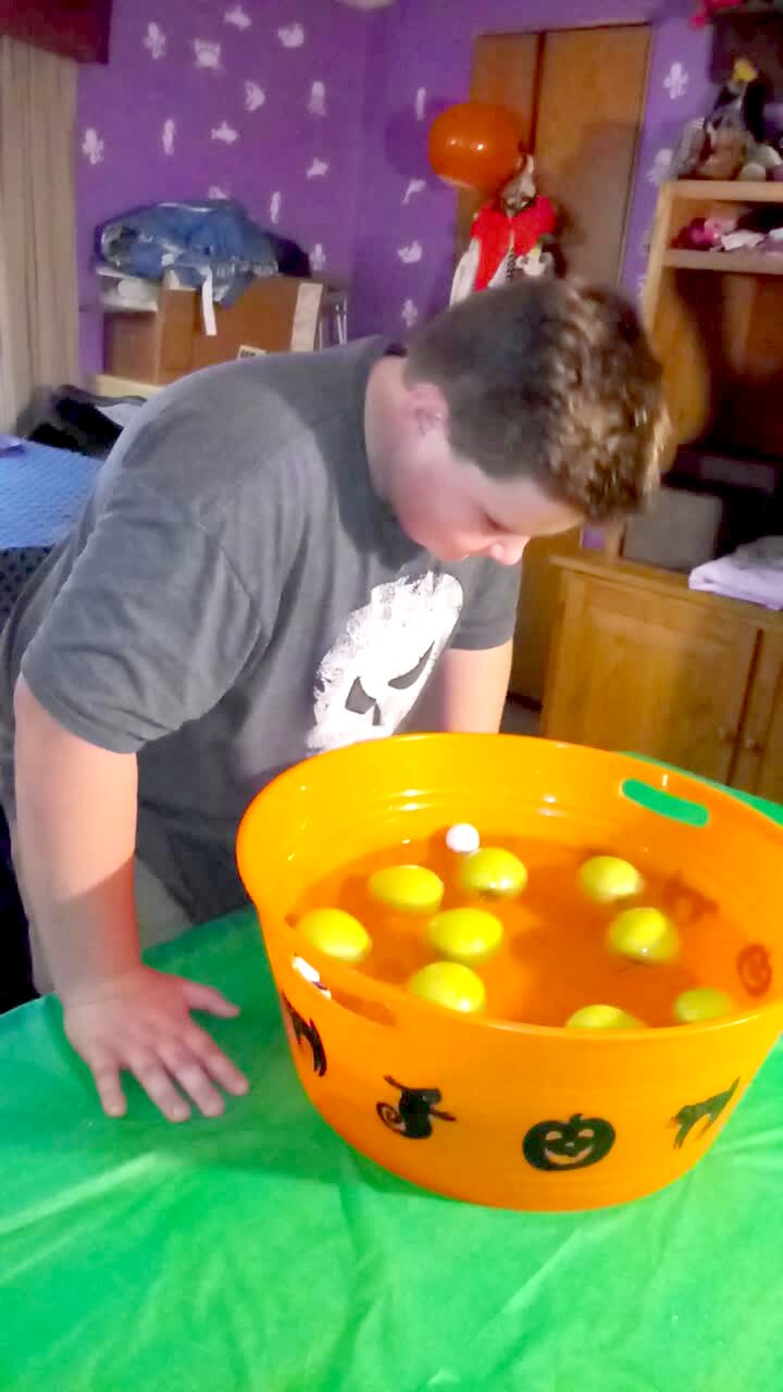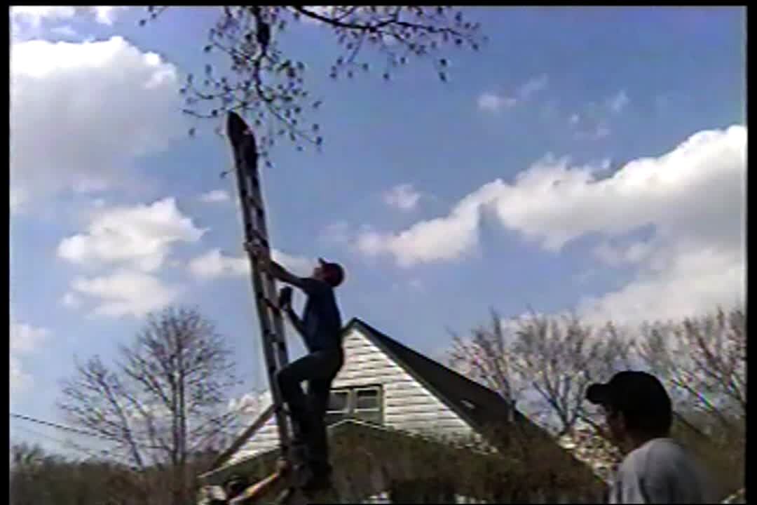 Teen boy dunks on basketball goal in driveway, goal collapses, boy falls in yard.