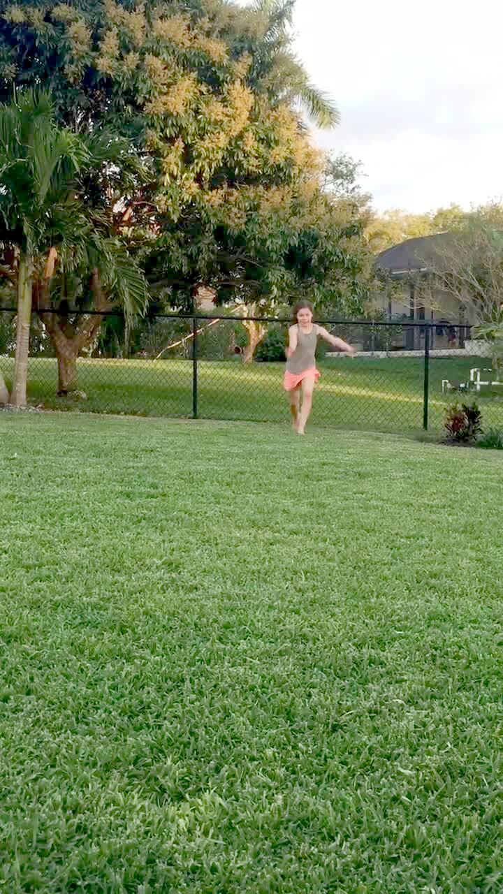 A teen girl shoots a basketball on a porch and then slips and slides into a wooden fence. The wooden slats fall where she crashes through the fence.