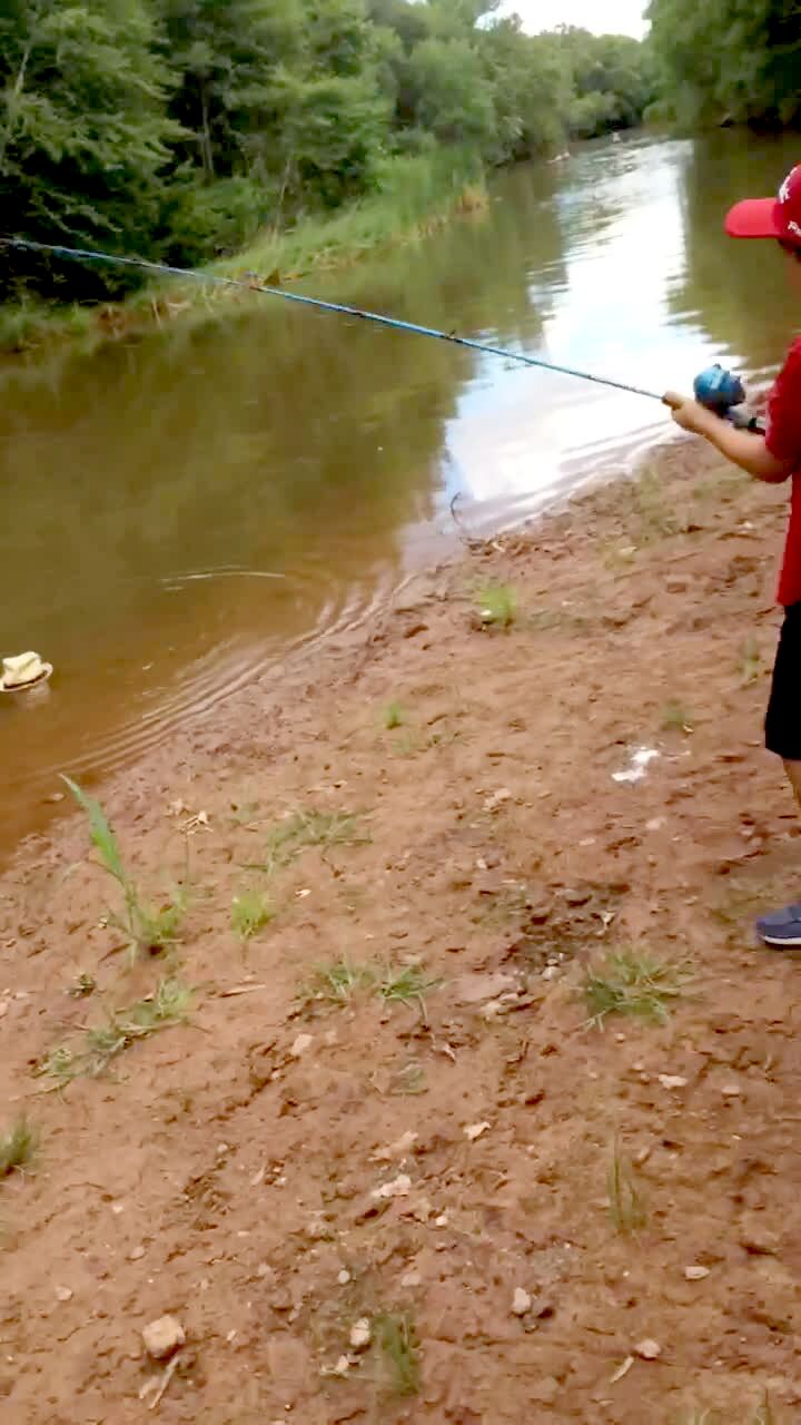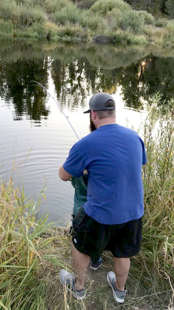 Young boy tries to cast fishing pole next to dad. Dad puts his hands up to protect himself & accidentally pushes boy into the water.