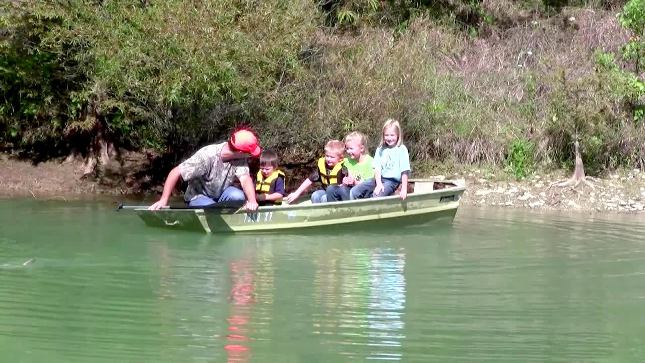 A man in a boat on a lake catches a fish with his bare hands and two young girls scream until he drops it back in.