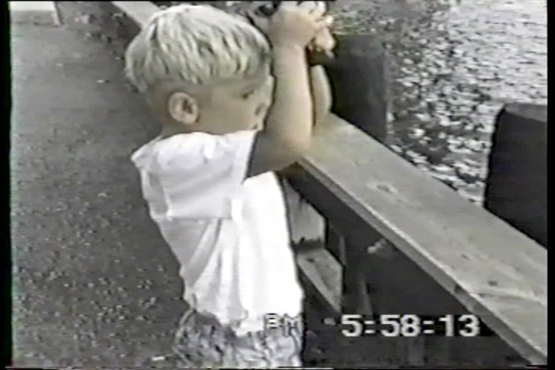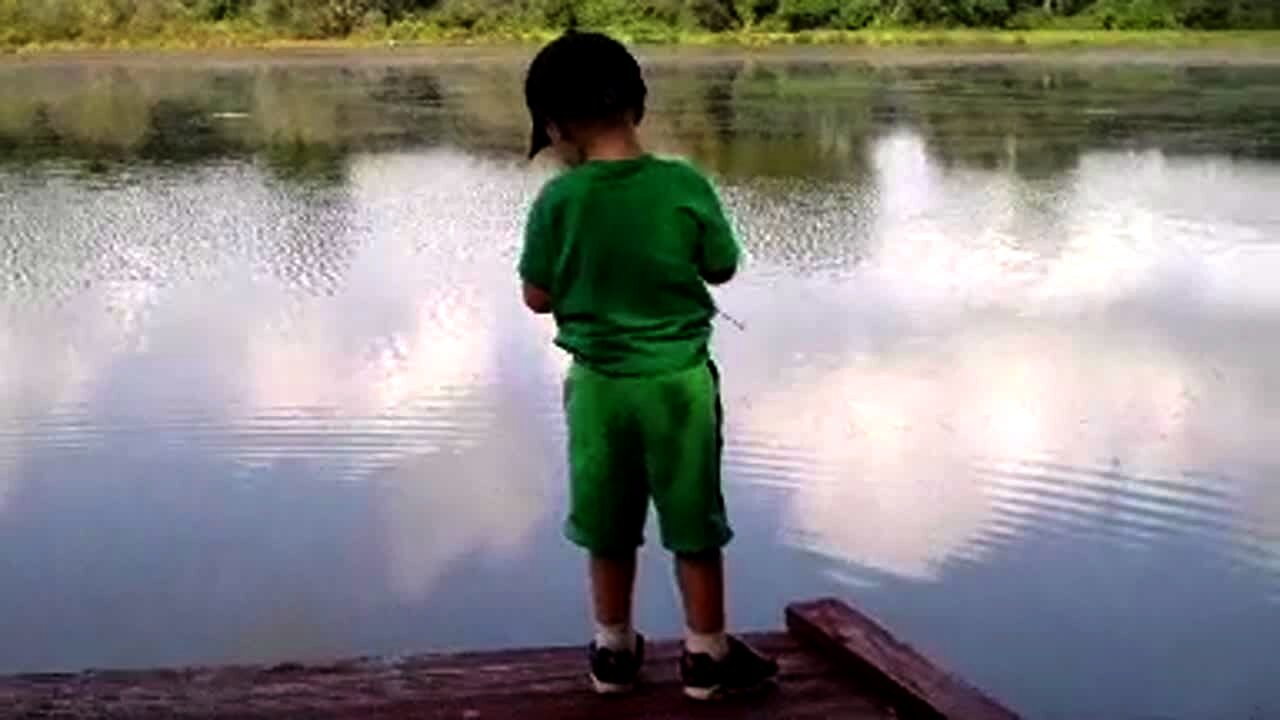 A boy tot tries fishing and falls into a lake. Action starts at 00:18.