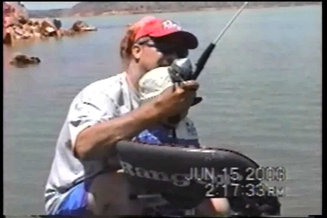 A man fishes with his boy tot by a lake, while a woman watches behind the camera. A fish in the water tugs at their fishing pole and drags it into the water before the man can catch it.