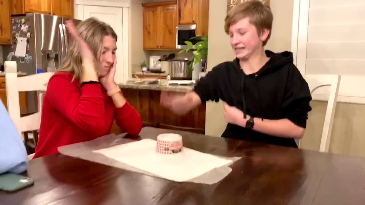 A young boy does the whipped cream challenge with a tot girl, and his whipped cream lands on the girl's head in the kitchen.