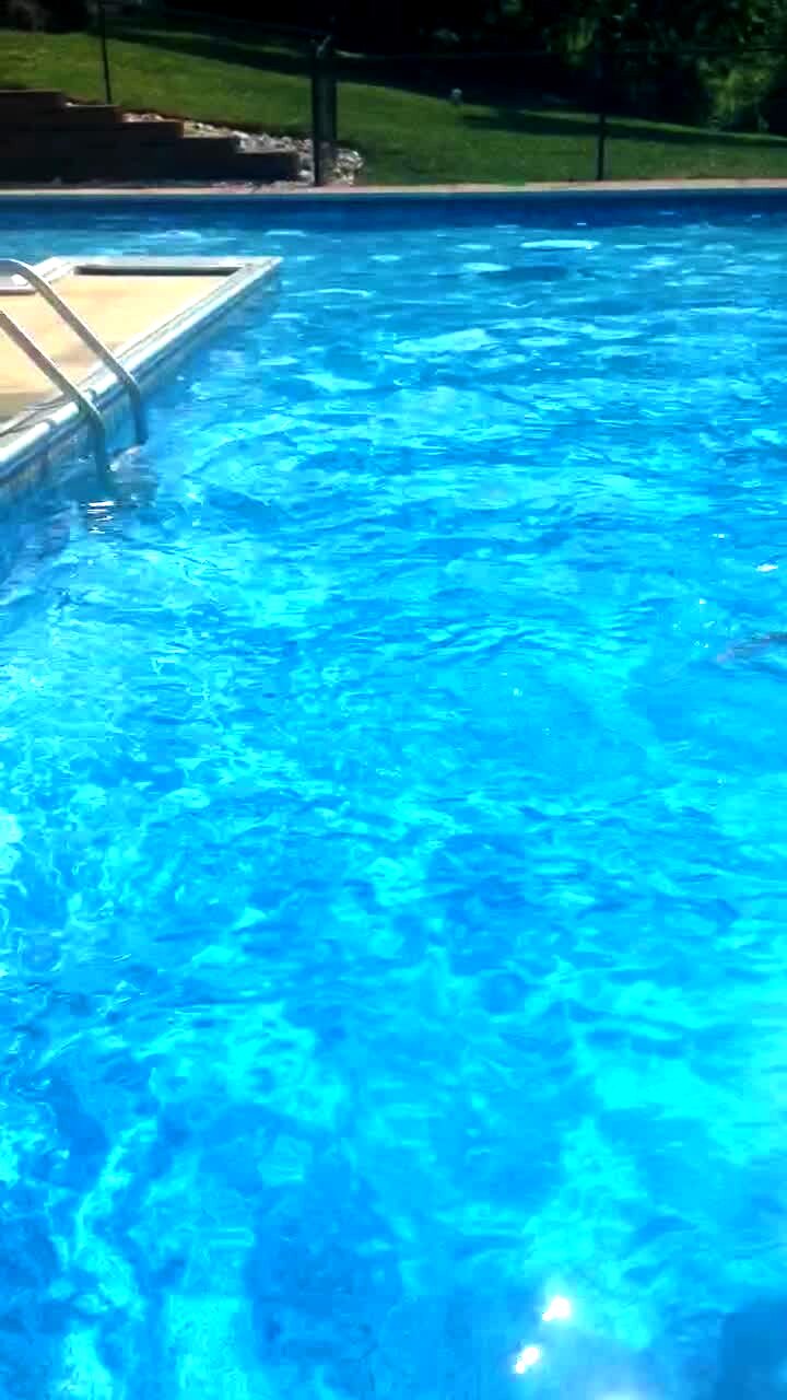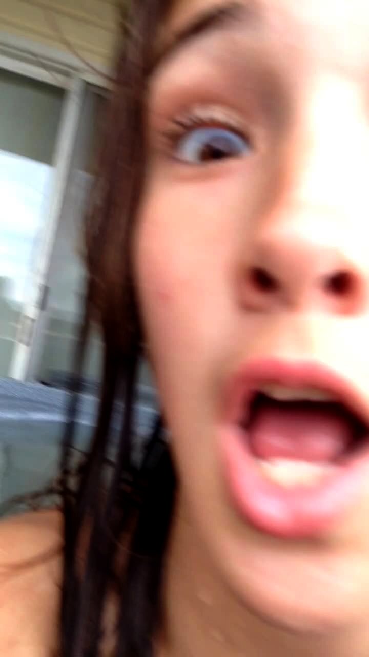 A young girl falls in a swimming pool while she talks to the camera about jumping in the water.