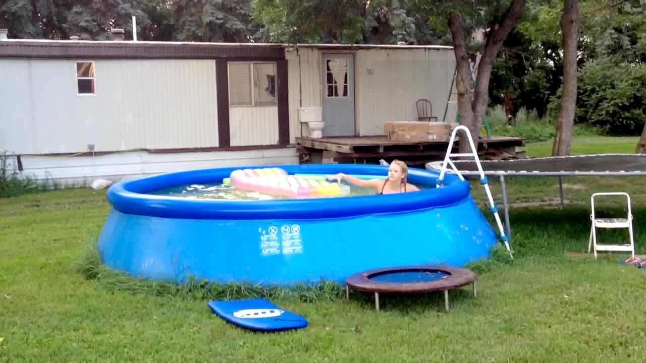 A teen girl tries to jump into a pool from a tree swing, but hits the side of the pool.