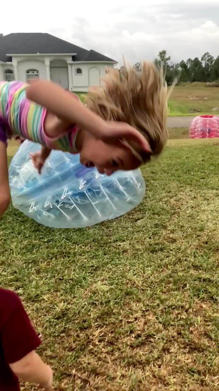 A young girl lands on her tot brother in slow motion after her father launches her through the air when he jumps on a bubble suit in the front yard.
