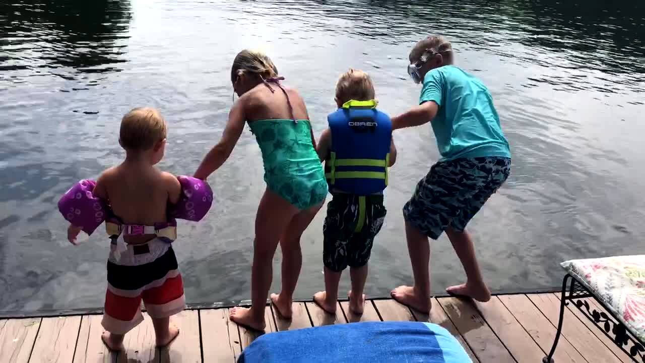 A young girl pulls her tot brother in to a lake while he wears water wings when she holds his hand as she jumps in to the lake with their two young brothers.