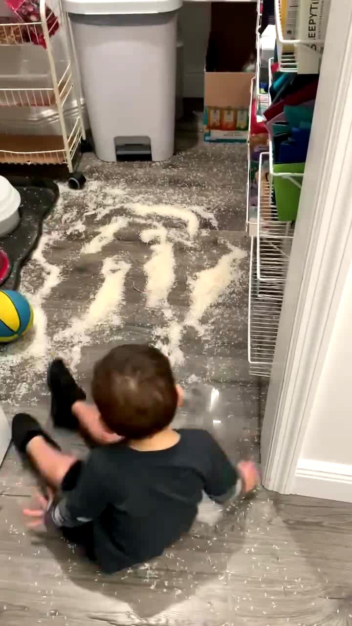A young boy stands and falls on rice on the floor as a woman talks to him in the pantry.