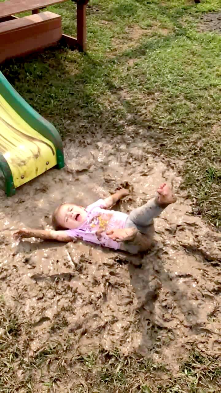 A tot girl goes down a slide in the yard, and falls onto her back in a mud puddle.