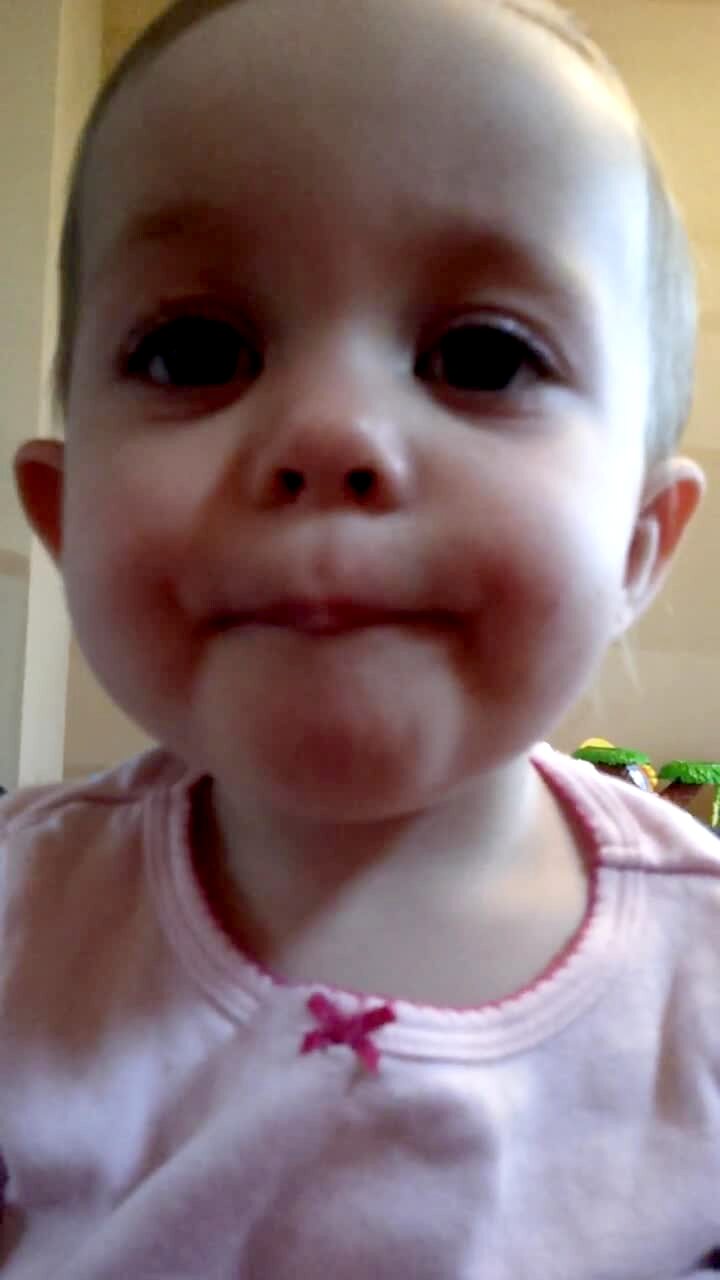 A cat in the living-room makes strange sounds, almost as if she is talking, as someone rubs her on the back.