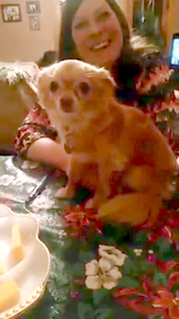 A chihuahua dog's ears go up and down as a woman as if she's hungry.