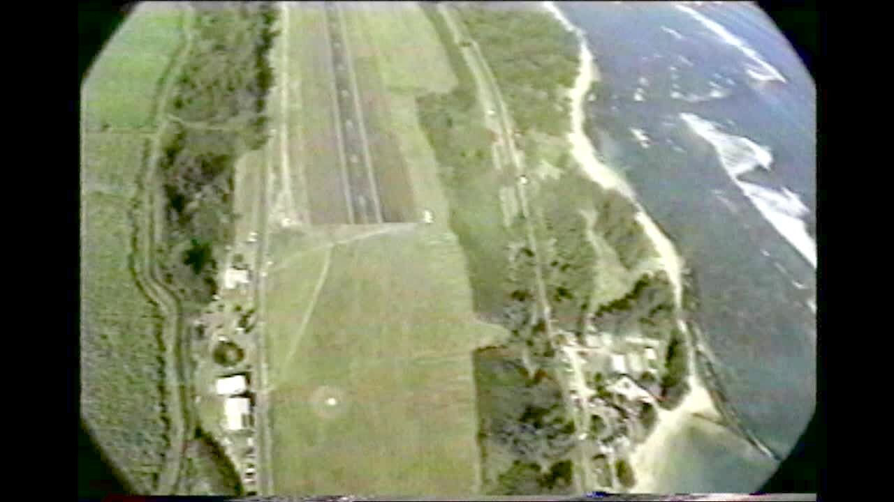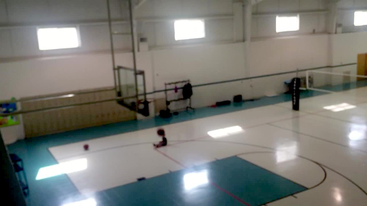 A young girl records herself flipping backwards on a bed. Her foot hits the ceiling fan and knocks off one of the blades.