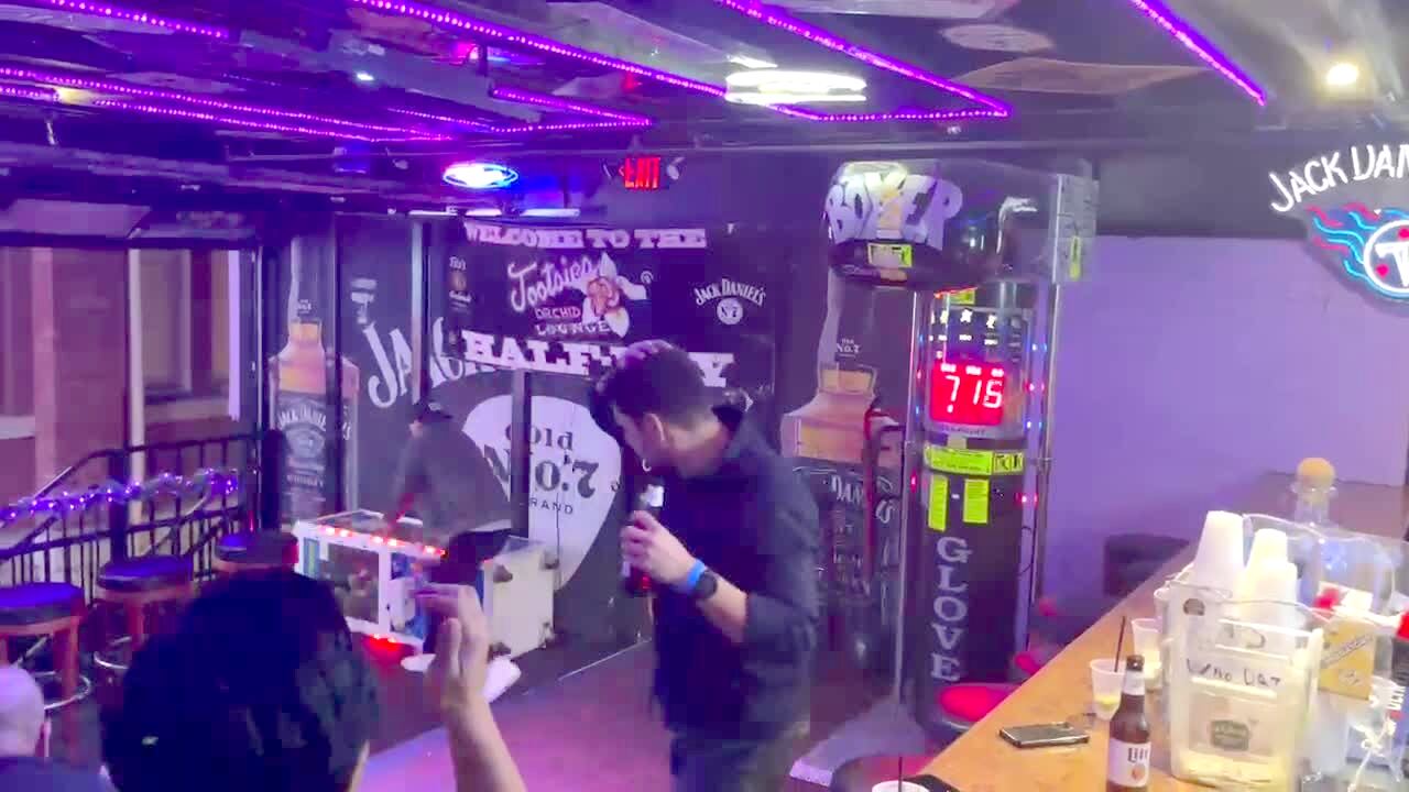 A pit bull dog gets stuck on the bottom rack of the dishwasher, then drags the rack across the kitchen floor. Security footage.