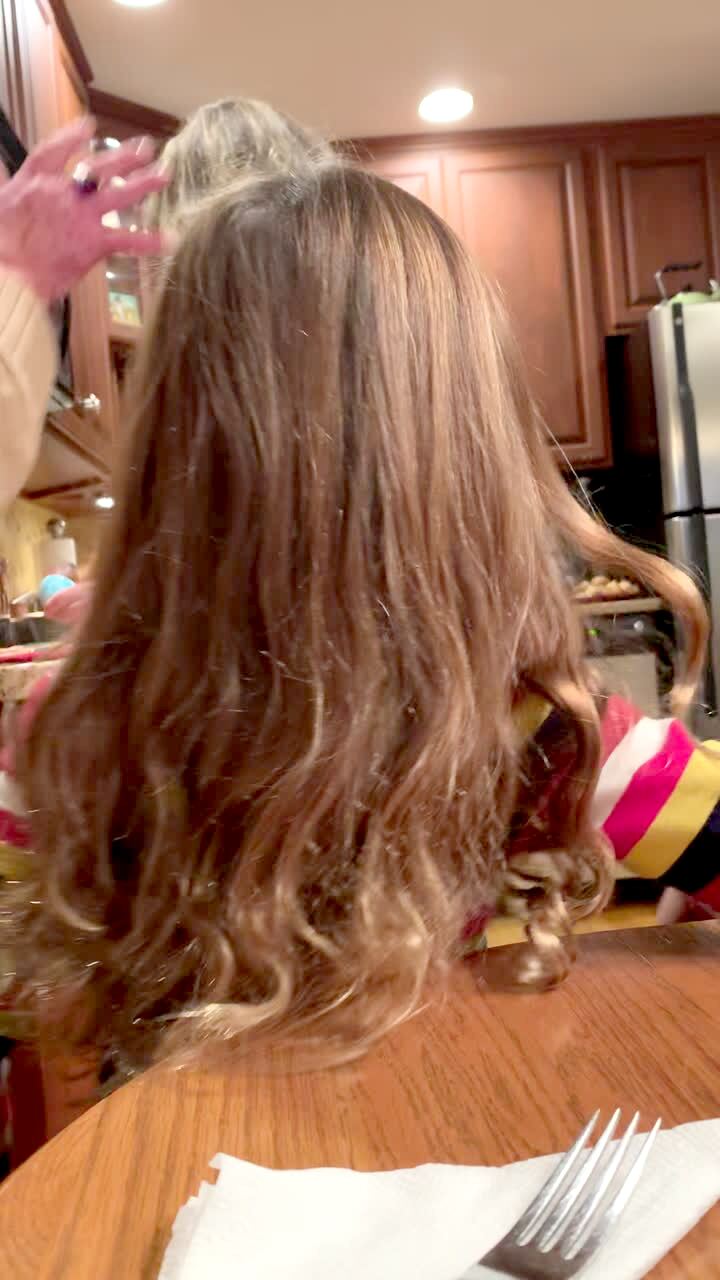 A young girl cuddles with a dog in the living room and the dog sneezes in her face. A woman off-camera says, "Now you know what it's like to be a mother!"