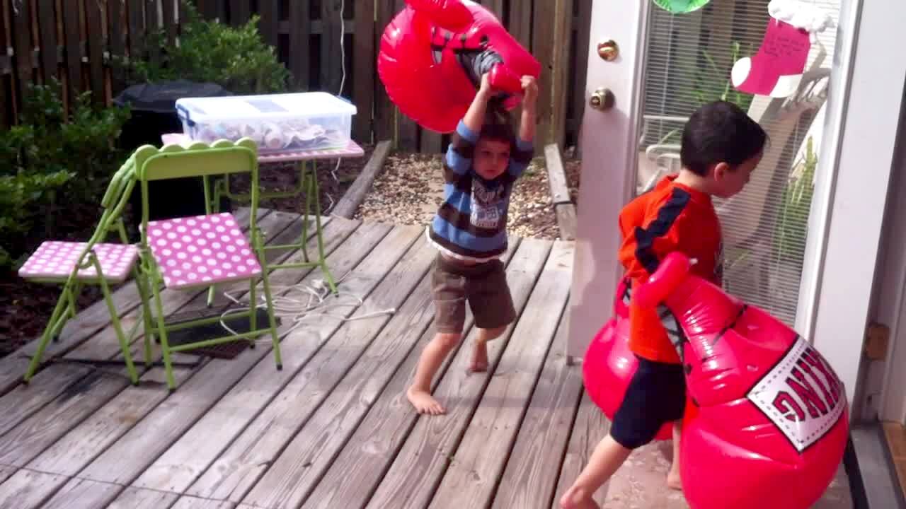A young boy knocks his brother down after he hits him in the back with an inflatable boxing glove after they play fight on the patio.