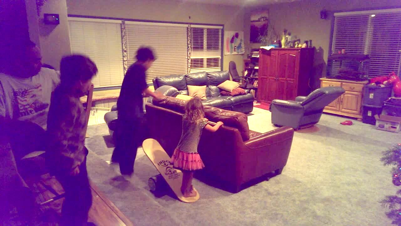 Two teen boys pick up a young boy in a living room by the arms and legs. They swing him back and forth right into the wall. Very jerky camera.