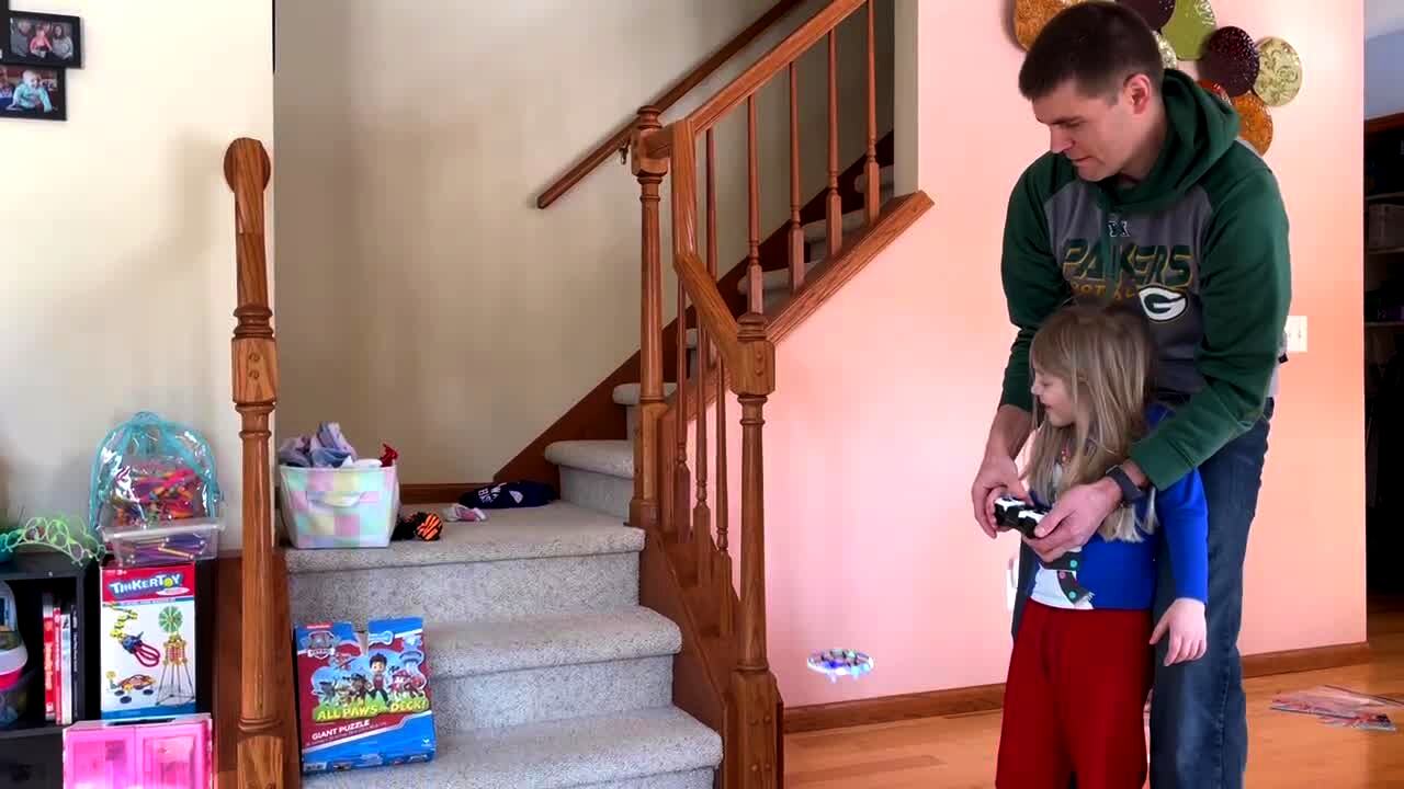 A man drops a giant teddy bear down a staircase in a home on a young girl. The young girl gets up and says "I'm okay!" Security camera.
