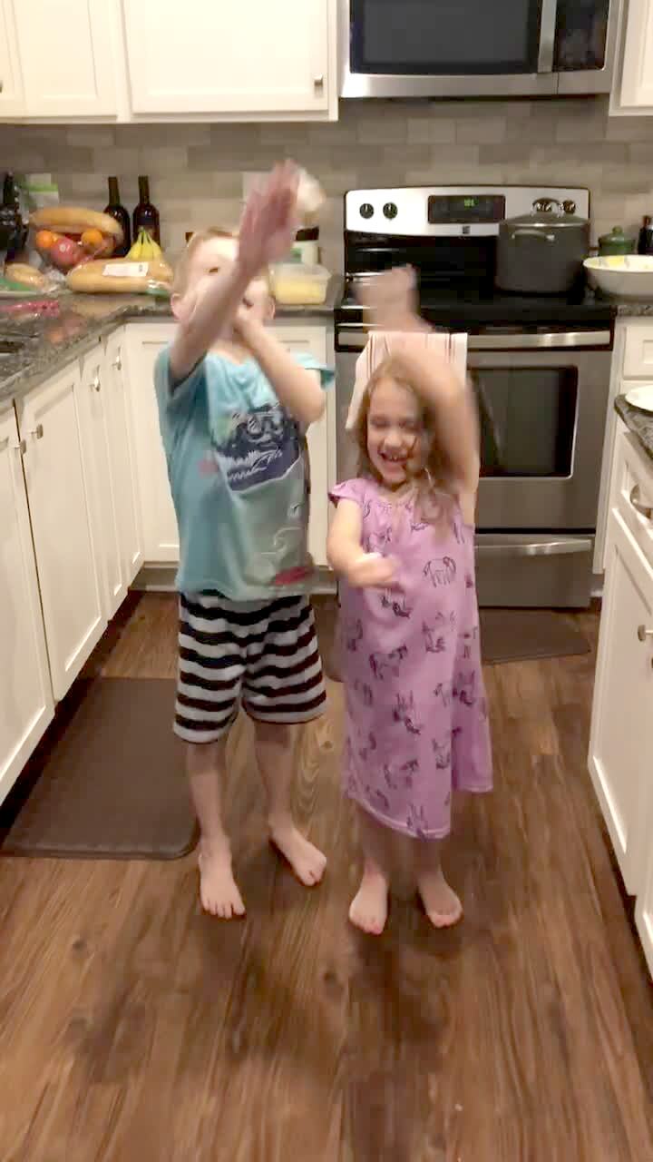 A young boy does the whipped cream challenge with a tot girl, and his whipped cream lands on the girl's head in the kitchen.