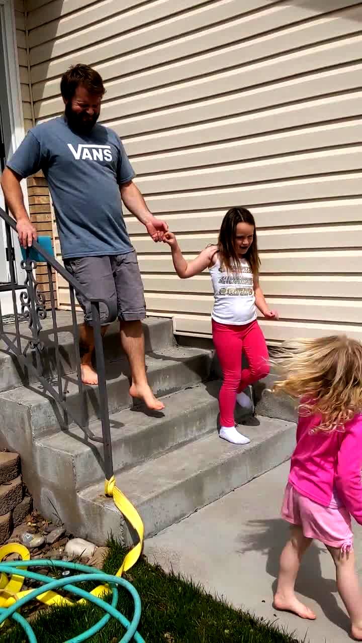 A young girl on her patio tries to run into the house to show a man something but runs into the sliding glass door instead. The dad asks the daughter if she's OK as she laughs. Security footage.