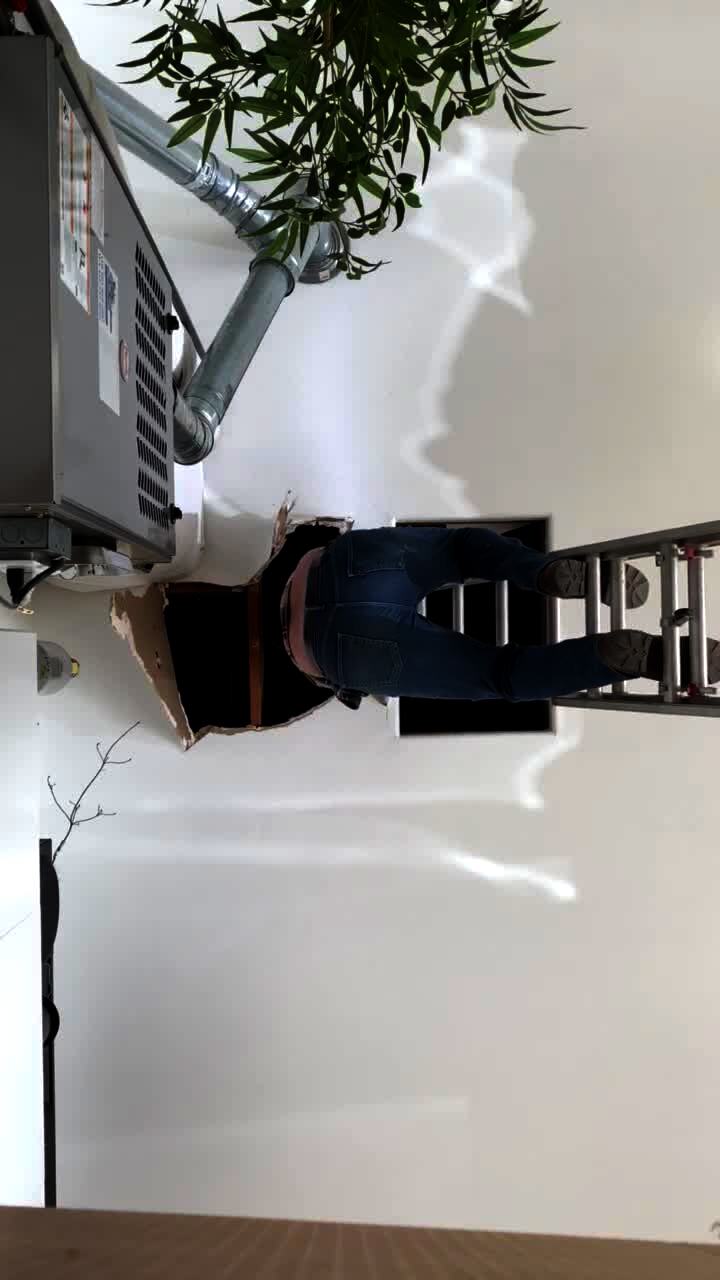 A man inspects his attic and then falls through the floor. His phone falls to the floor in the room below as he hangs over it, and then he manages to reach the ladder and climb down.