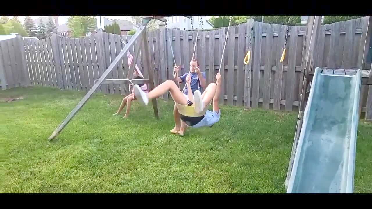 A man tries to swing with his young girls on the backyard swing set, and breaks the entire structure.