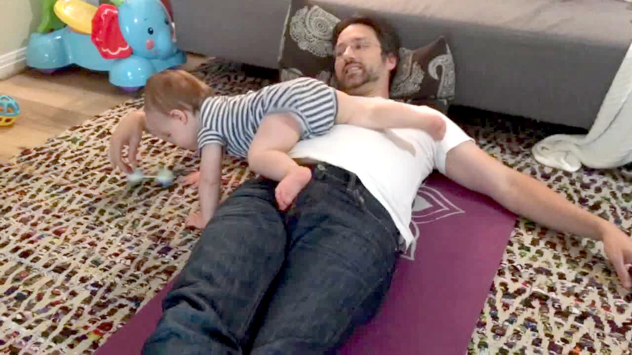 A baby girl kicks her dad in the groin as she crawls over him while he's lying on the floor.