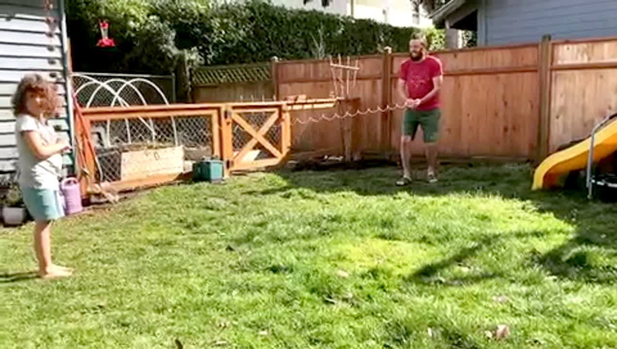 A man swings on a rope in the backyard, and breaks a kid's table below him when he falls.