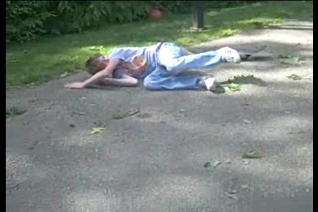 Teen boy dunks on basketball goal in driveway, goal collapses, boy falls in yard.