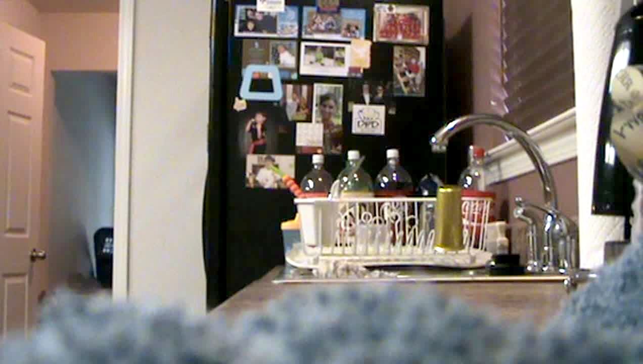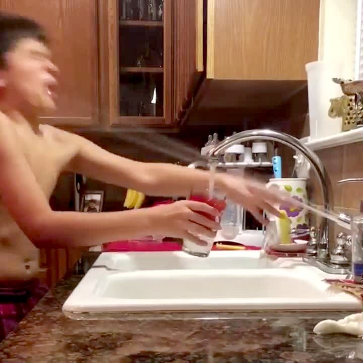Boy turns on the sink and gets sprayed by a trick faucet that has a taped hose. Practical joke. Kitchen.