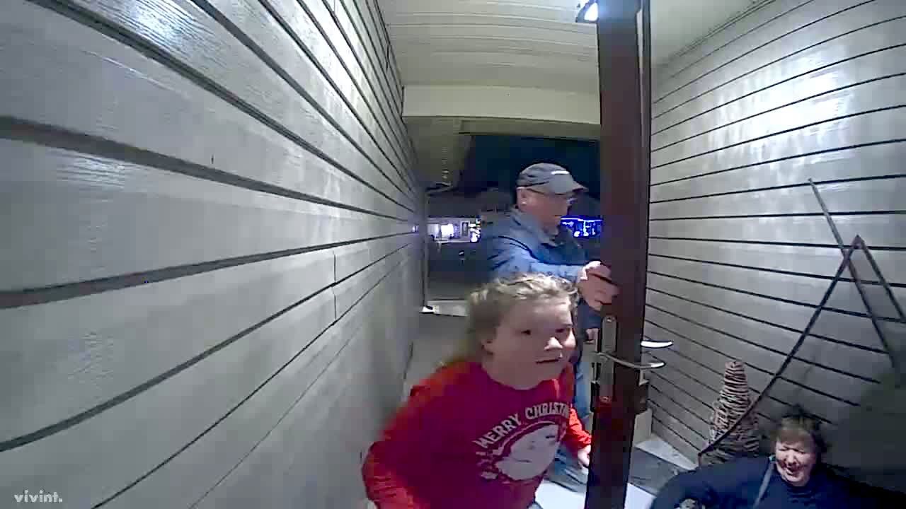 A man and woman leave the house, but the man trips and falls and knocks the woman off the porch. Security footage.