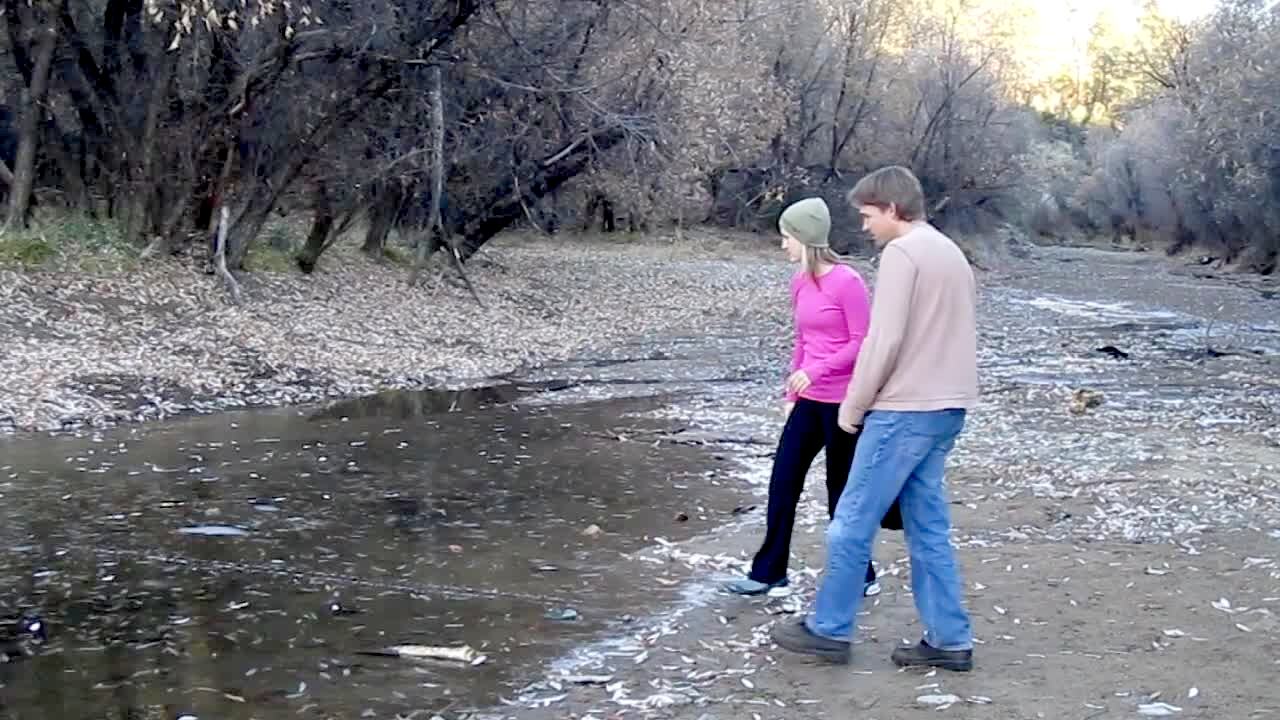 Teen girl tries to run/slide across frozen creek, slips, falls on her butt through the ice.