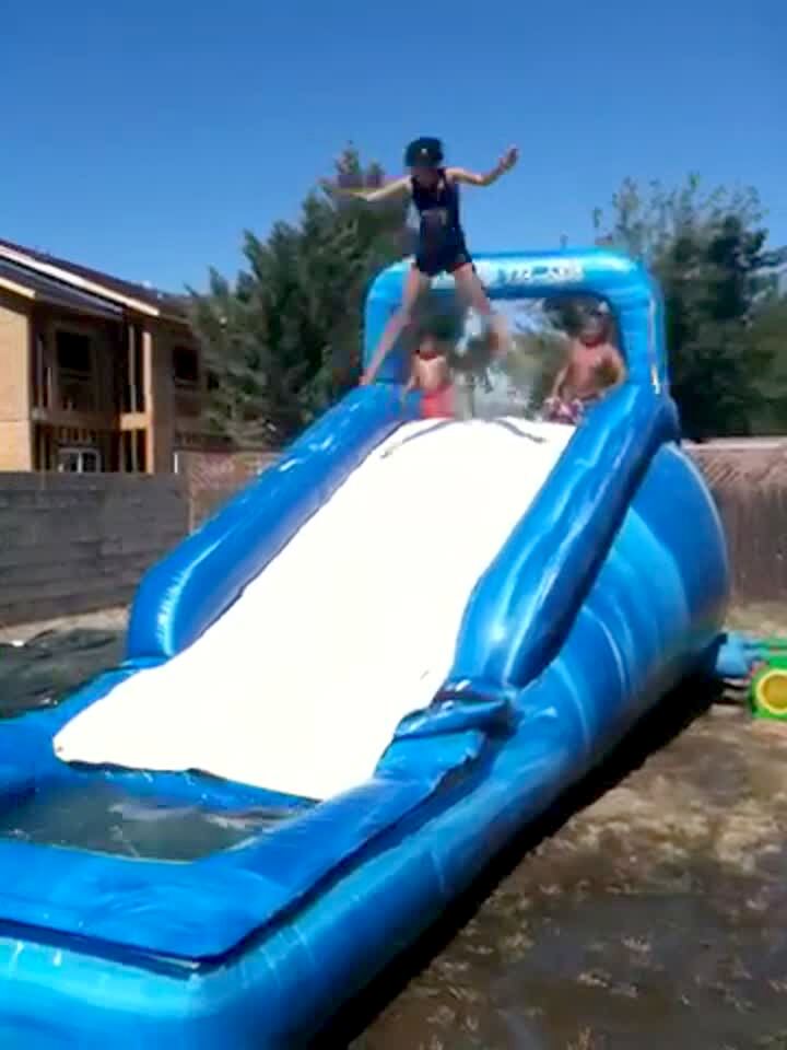 A teen girl jumps off the top of an inflatable backyard water slide. She touches her toes, lands in the water at the bottom of the slide, and bounces off the end of the slide into the grass. Short heads. Short tails.