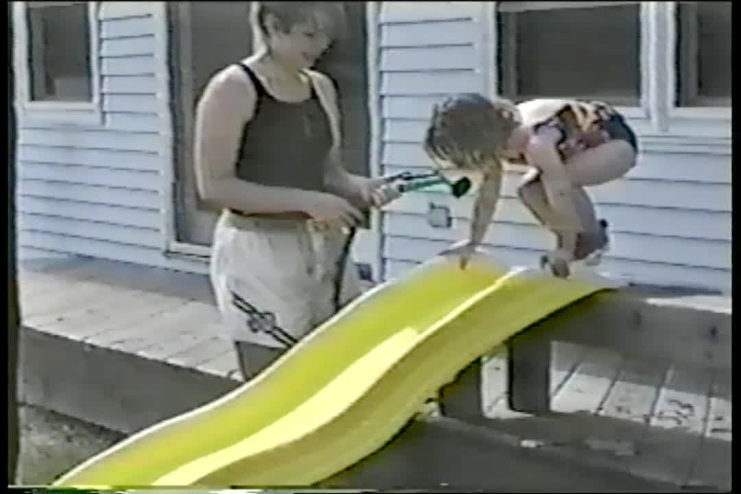 A teen girl hydro-slides behind a boat when a twenty pound fish flies up and hits her in the face and she falls into the water.