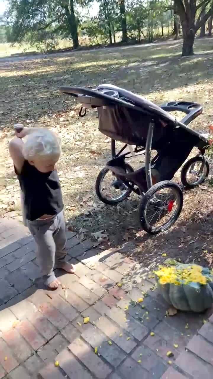 A woman records a vlog where she says, "why try to decorate for Halloween and the fall?" as a young smashes her pumpkins with a baseball bat.