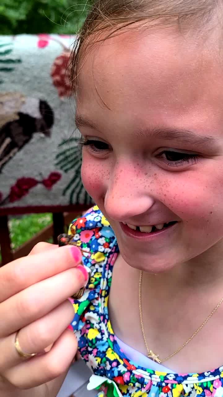 A young girl holds a cicada bug on a deck, then puts it on her nose and tells a woman to take a picture while it walks on her face.