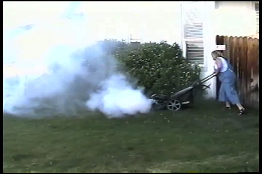 A woman mows the backyard lawn on a ridining lawnmower. The mower catches the stone fire pit and breaks it as she drives by.