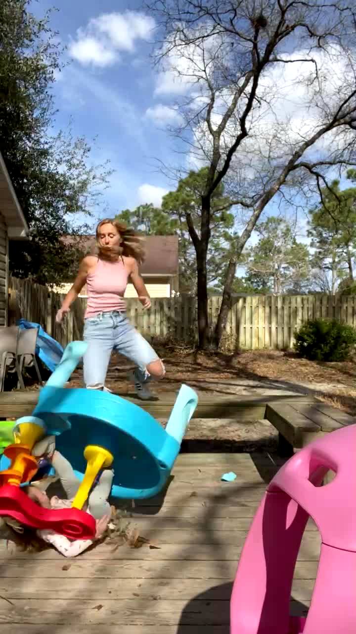 A woman and a young girl walk across an "obstacle course" of toys. The girl steps onto a toy, stumbling and falling backwards onto the patio.