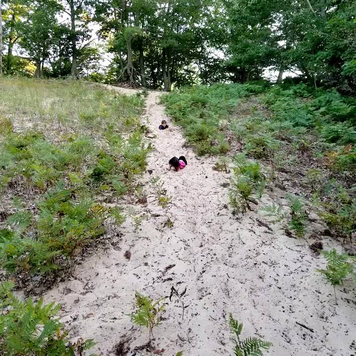 A young girl and boy run down a hill in the woods and they both trip and fall at the same time.