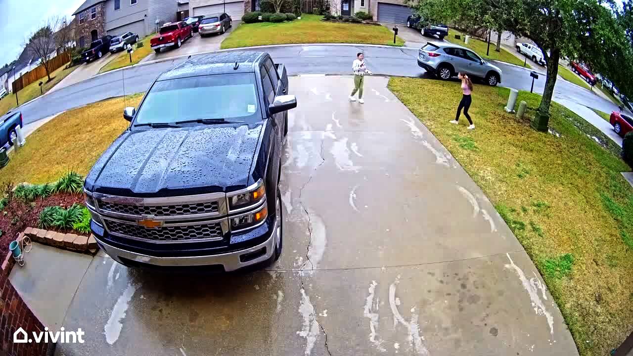 Two teen girls hit a volleyball back and forth in the driveway. One of them runs into the yard to get the ball and slips on wet grass and falls. Security footage.