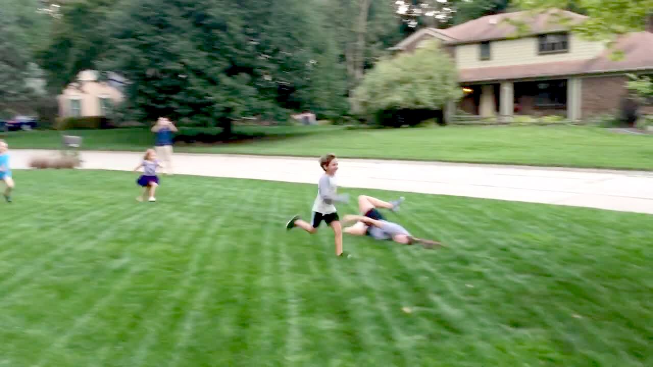 A woman trips and falls in the yard while she races against two young boys and a young girl.