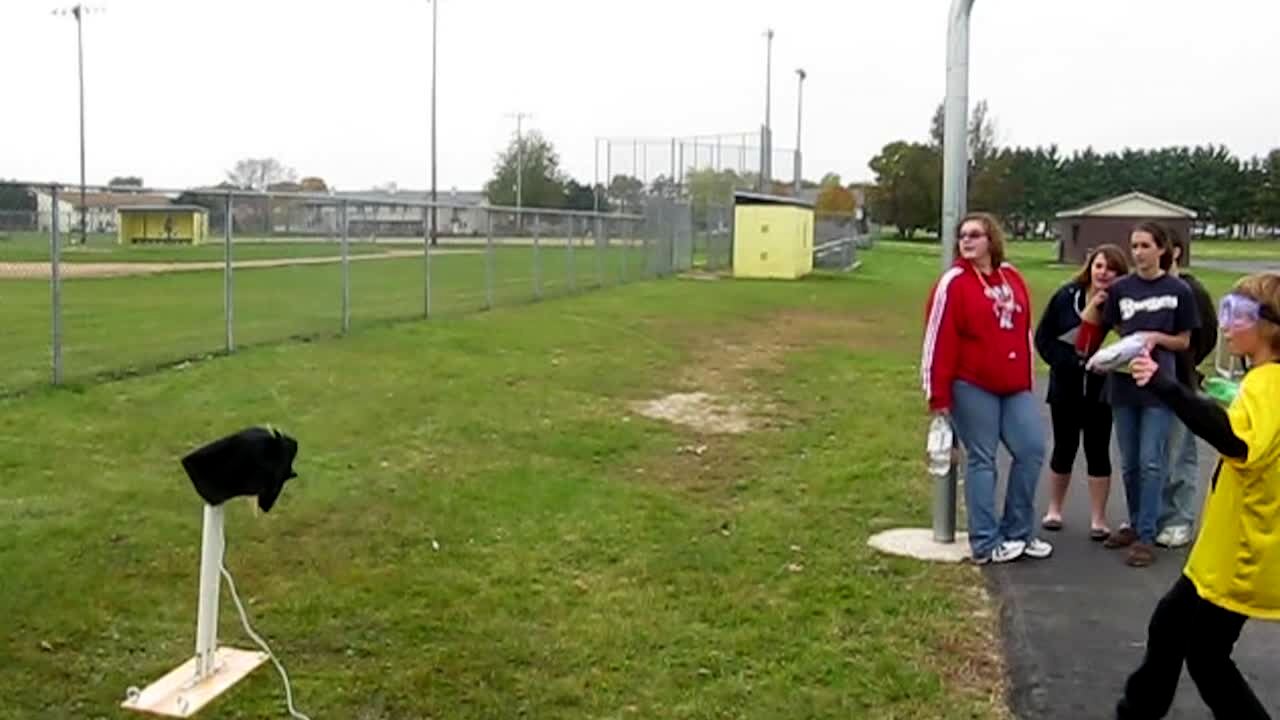 A man looks into the camera and throws a rubber ball over his shoulder and the ball hits the roof and rolls off, bouncing off a mini-trampoline, and goes into a basketball net on the lawn.