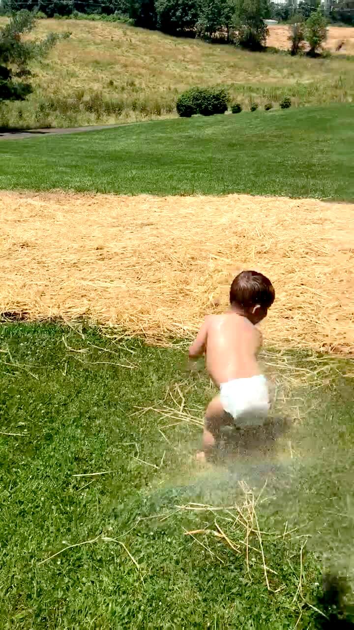 A tot boy walks towards a sliding glass door. He thinks the door is closed and attempts to lean his body onto the glass but door is open, and he falls through the door frame onto a back patio.