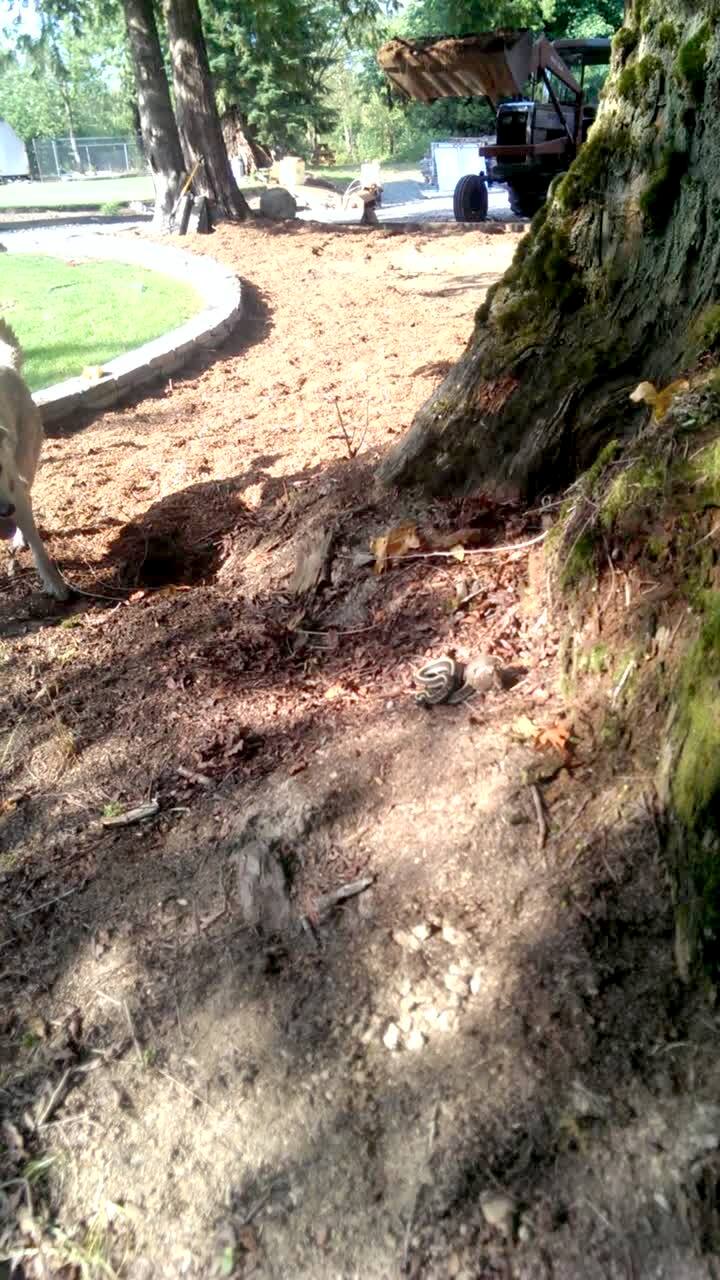 A cat relaxes by the edge of a pond in a yard and rolls over and falls into the water and scrambles out while the woman filming laughs.